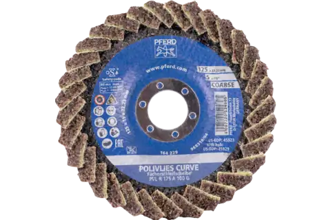 PN 44694131PFERD$81.35 / each| /POLIVLIES-CURVE flap disc PVL-R aluminium oxide dia. 125 mm hole 22.23 mm A100G for fine grinding for work on fillet welds Description: ...